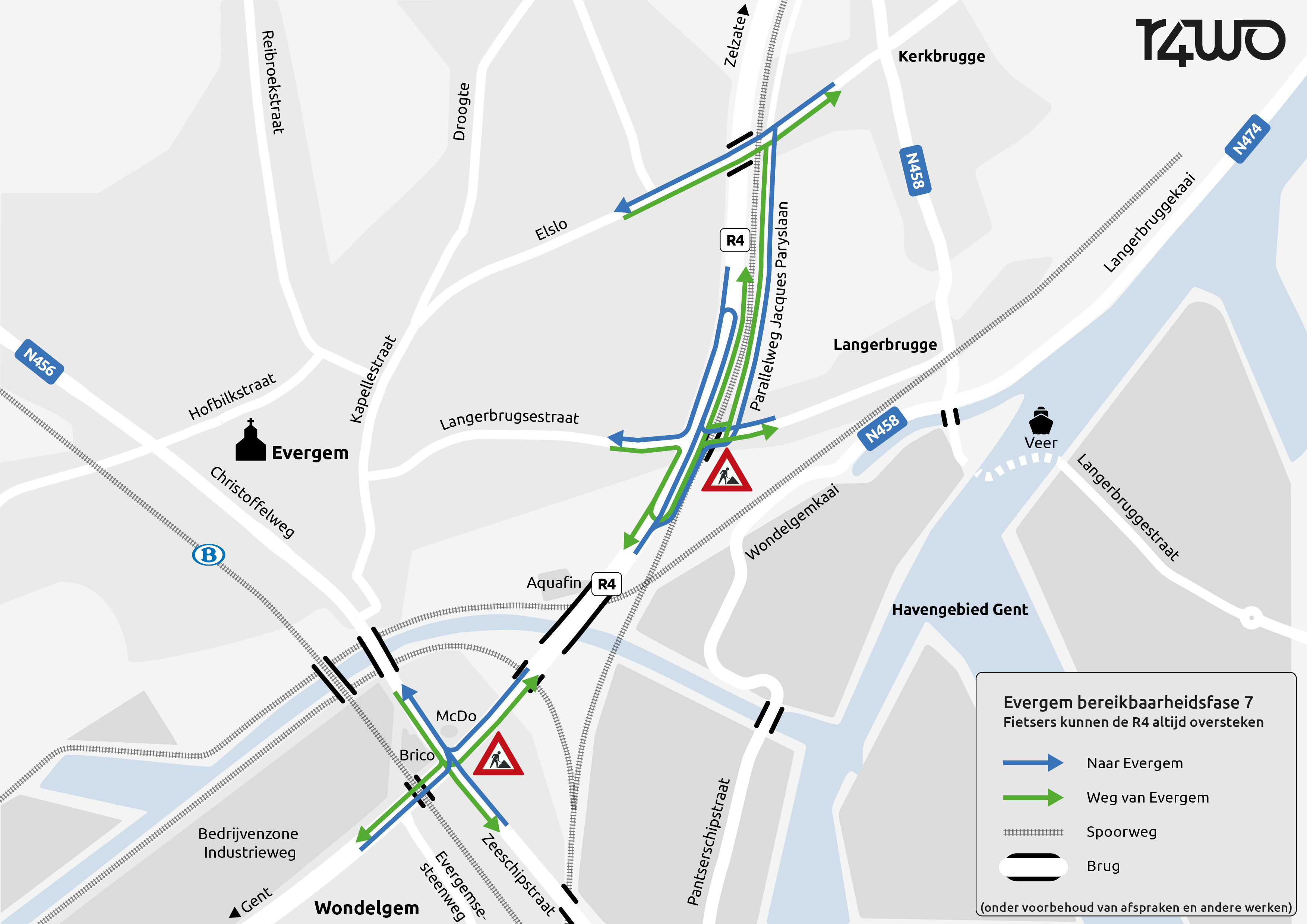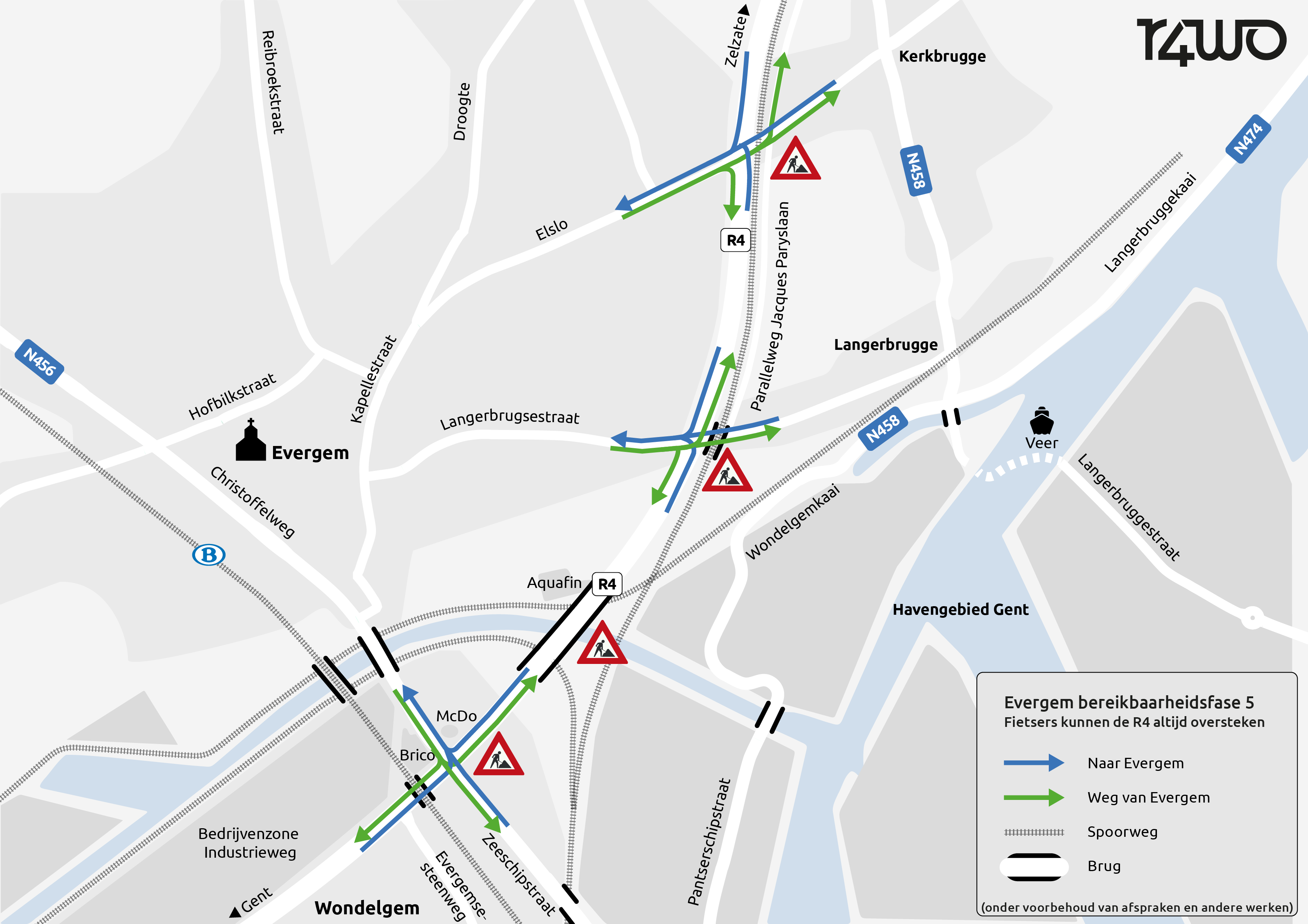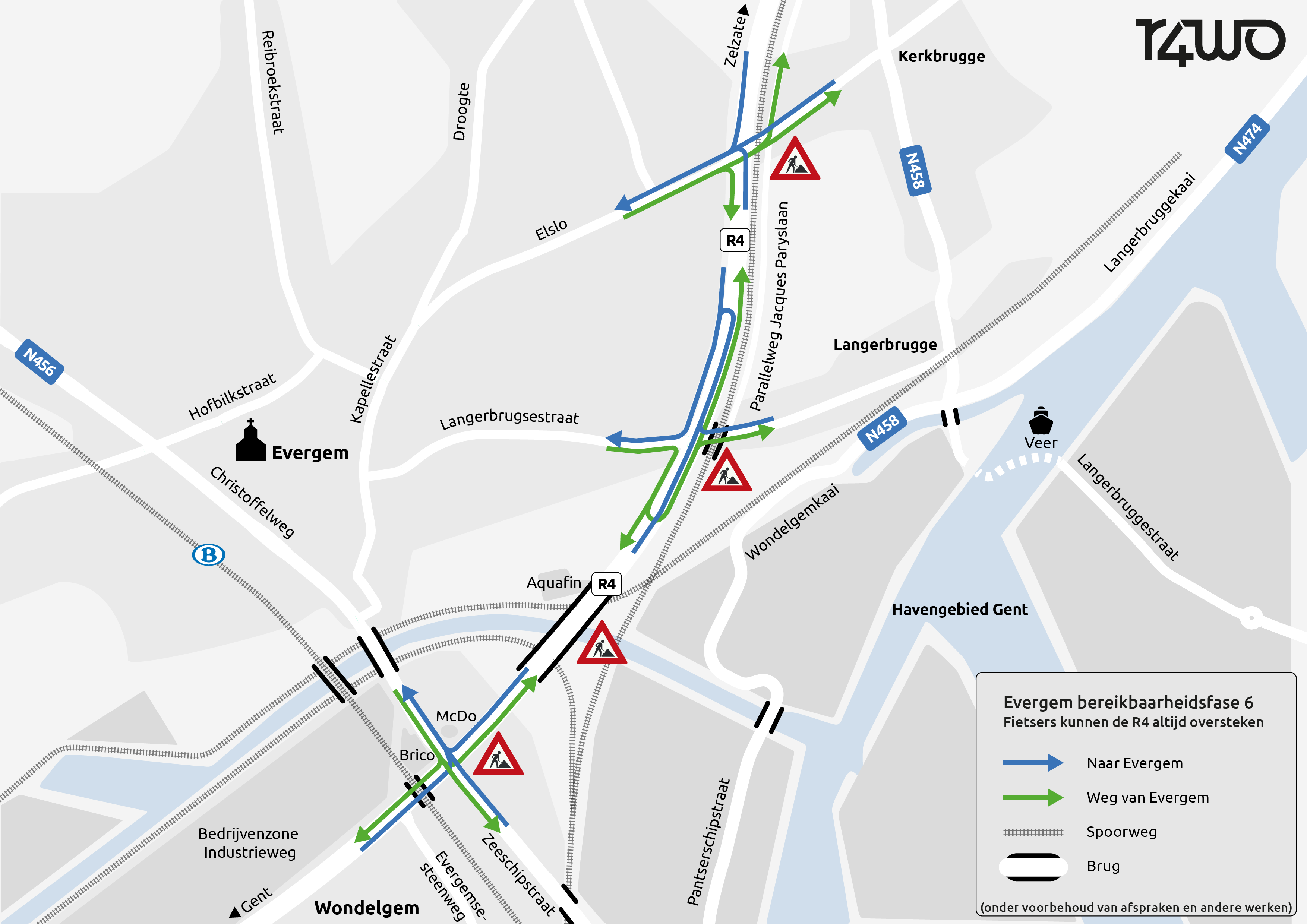- Met de fiets van en naar Evergem kan je aan elk kruispunt de R4 oversteken. Aan het knooppunt Langerbrugsestraat voorzien we een plaatselijk fietspad rond de bouwput.