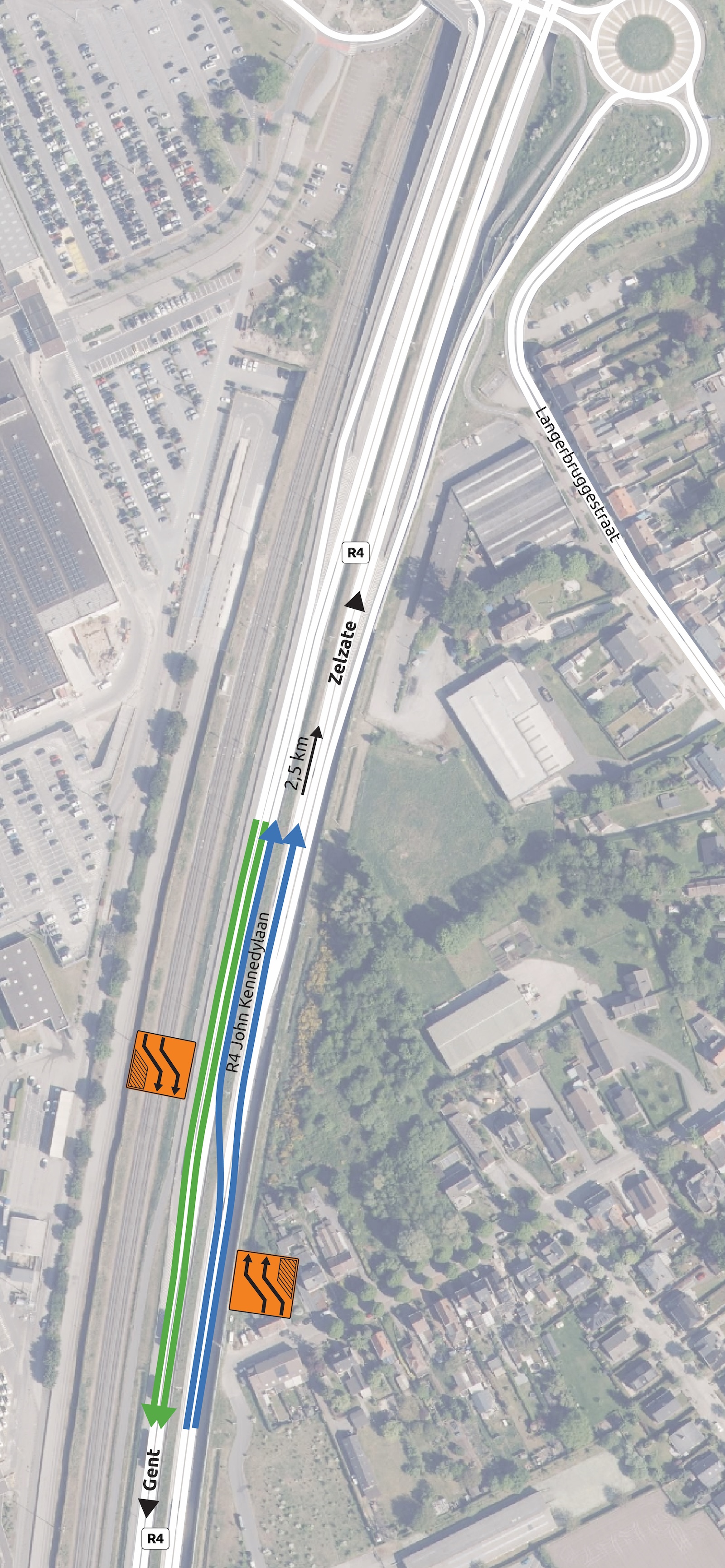 • De rechterrijstrook richting Zelzate blijft op de rijbaan richting Zelzate liggen.