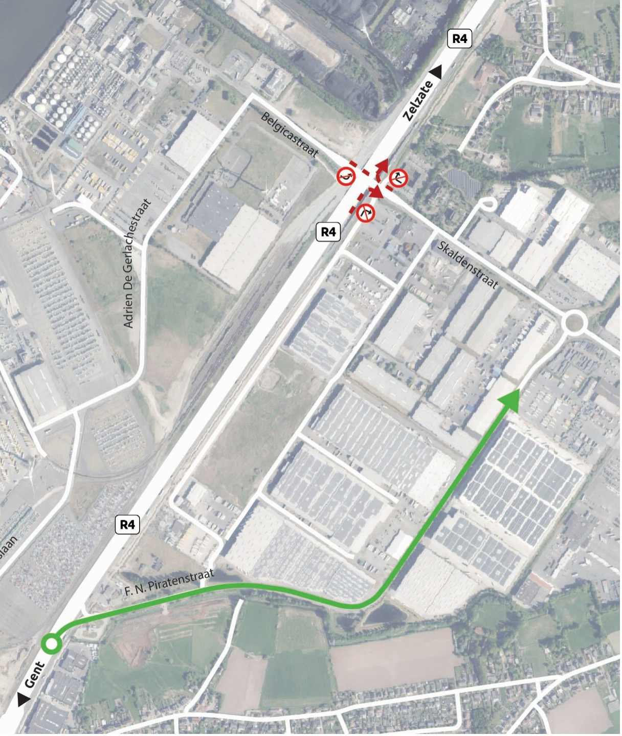 Tegelijk starten we met een volgende fase van de werken. Hierdoor wordt de op- en afrit Skaldenstraat in de rijrichting Zelzate tijdelijk afgesloten voor al het gemotoriseerd verkeer.