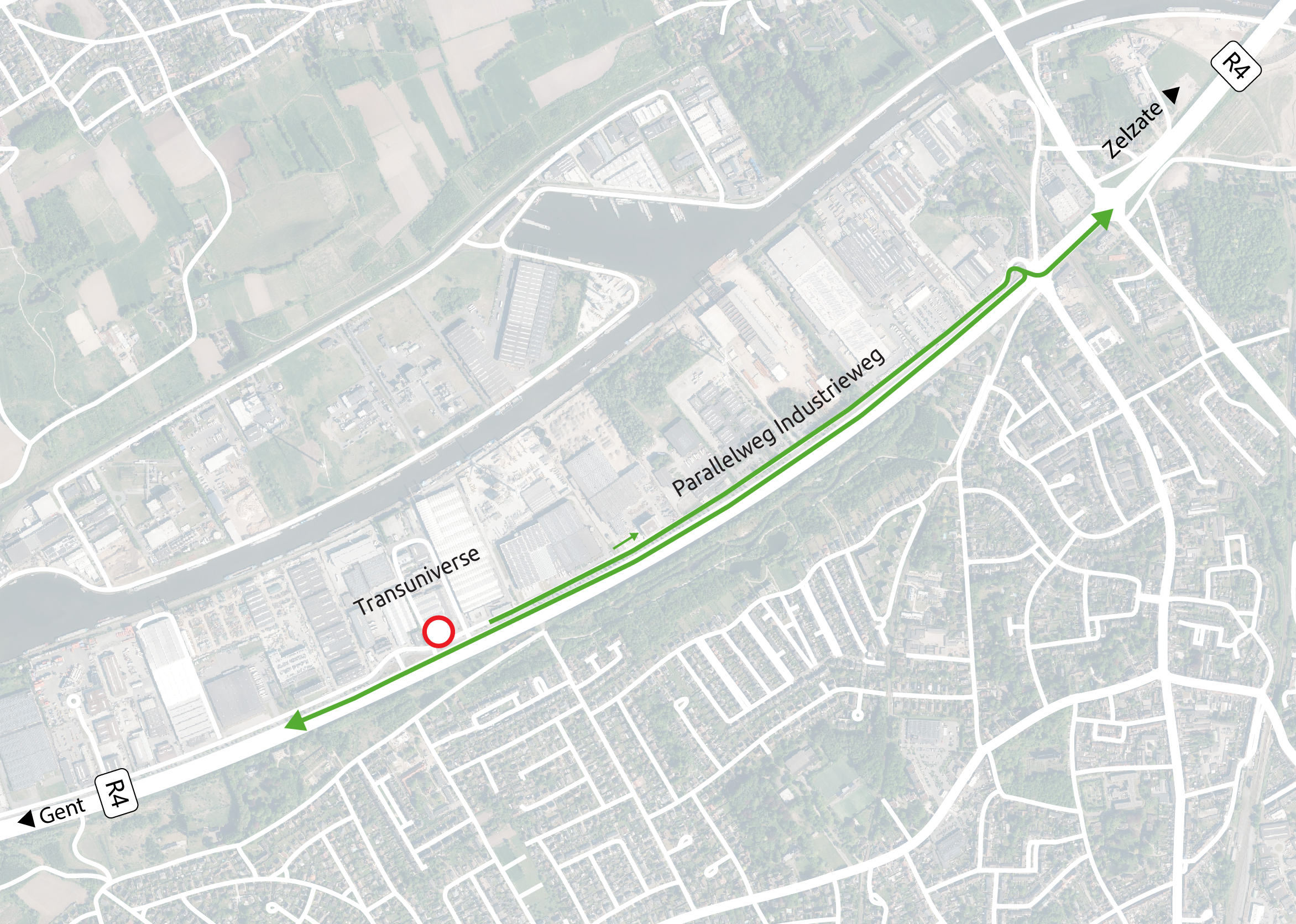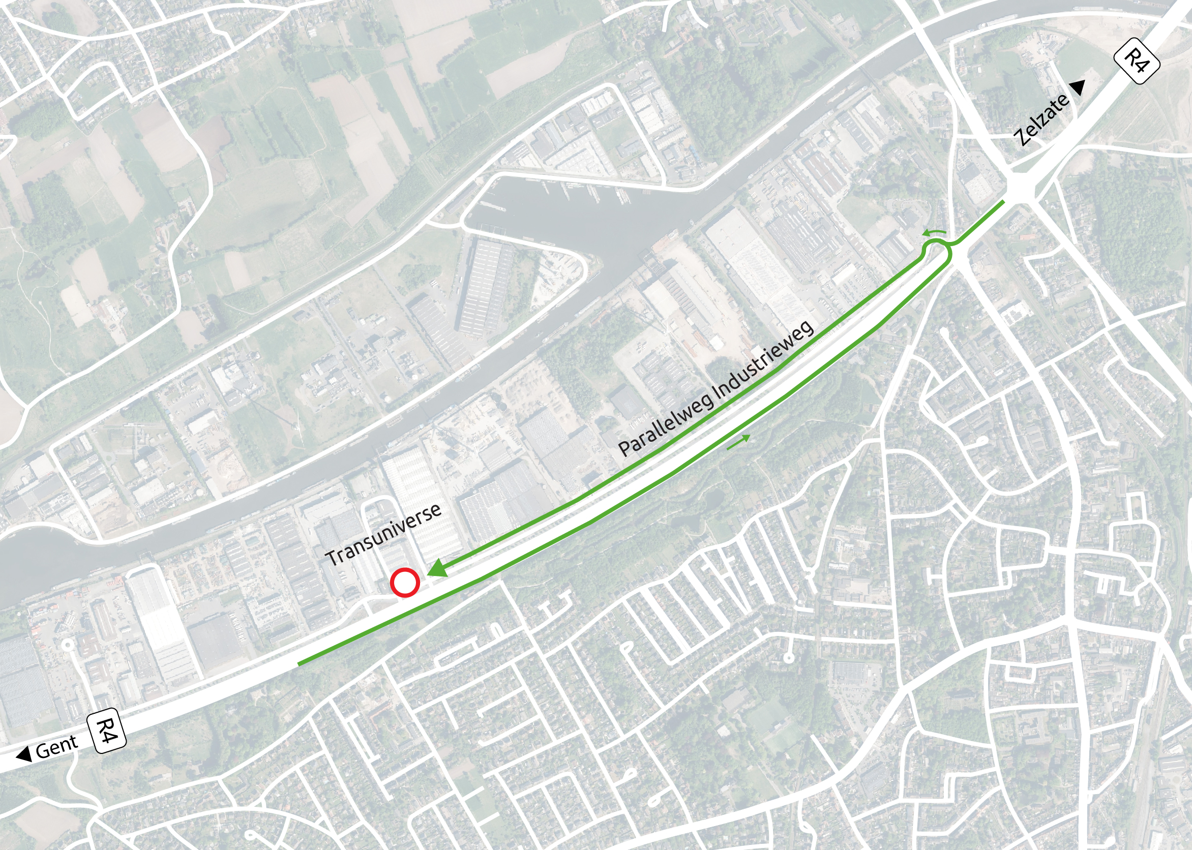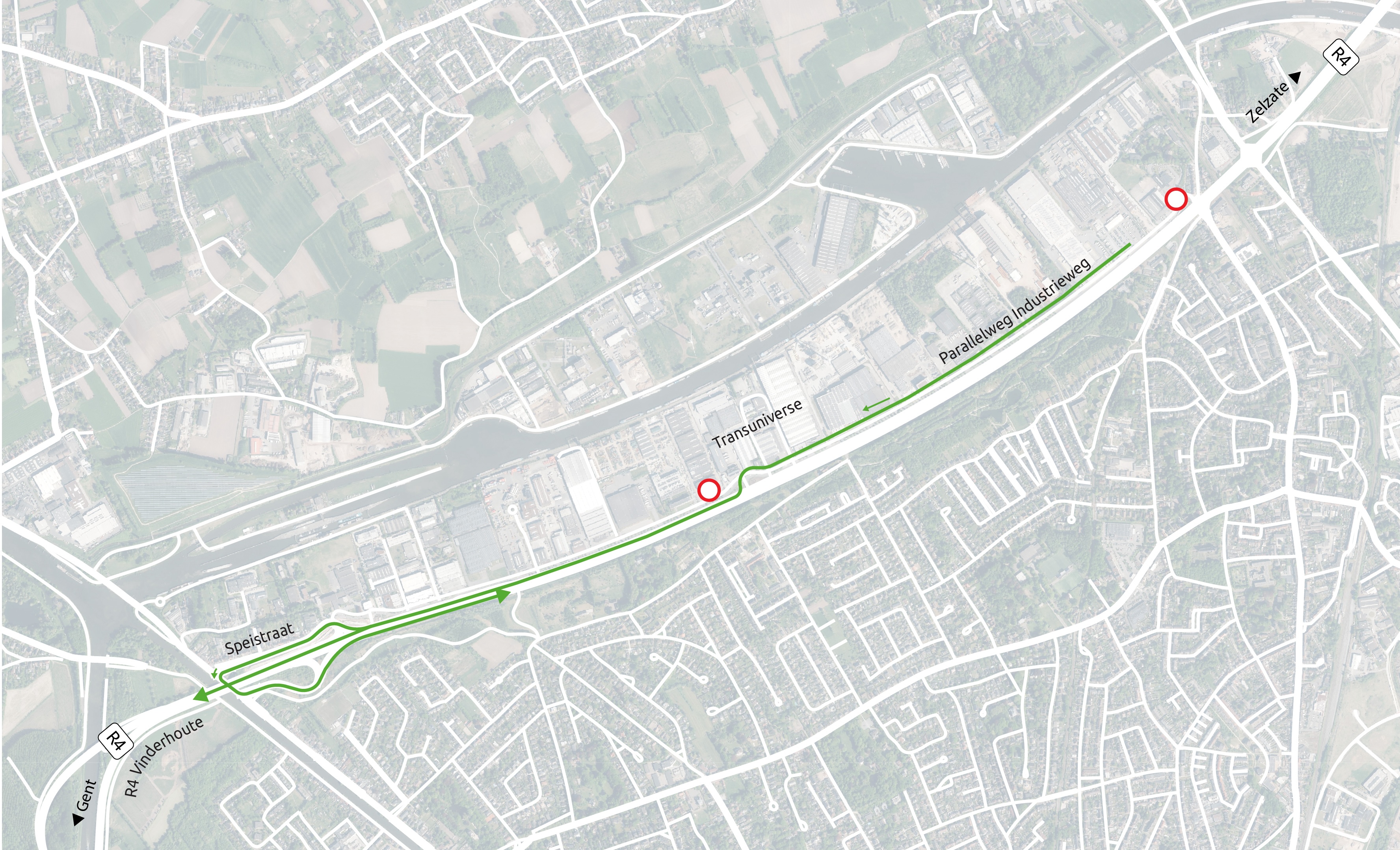 - Vanaf 28 november tot 12 december: afsluiting Industrieweg ten oosten van de op- en afrit Transuniverse voor alle verkeer. Omleiding R4 en knooppunt Zeeschipstraat-Evergemsesteenweg (kruispunt Schouwingsstraat-Evergemsesteenweg).