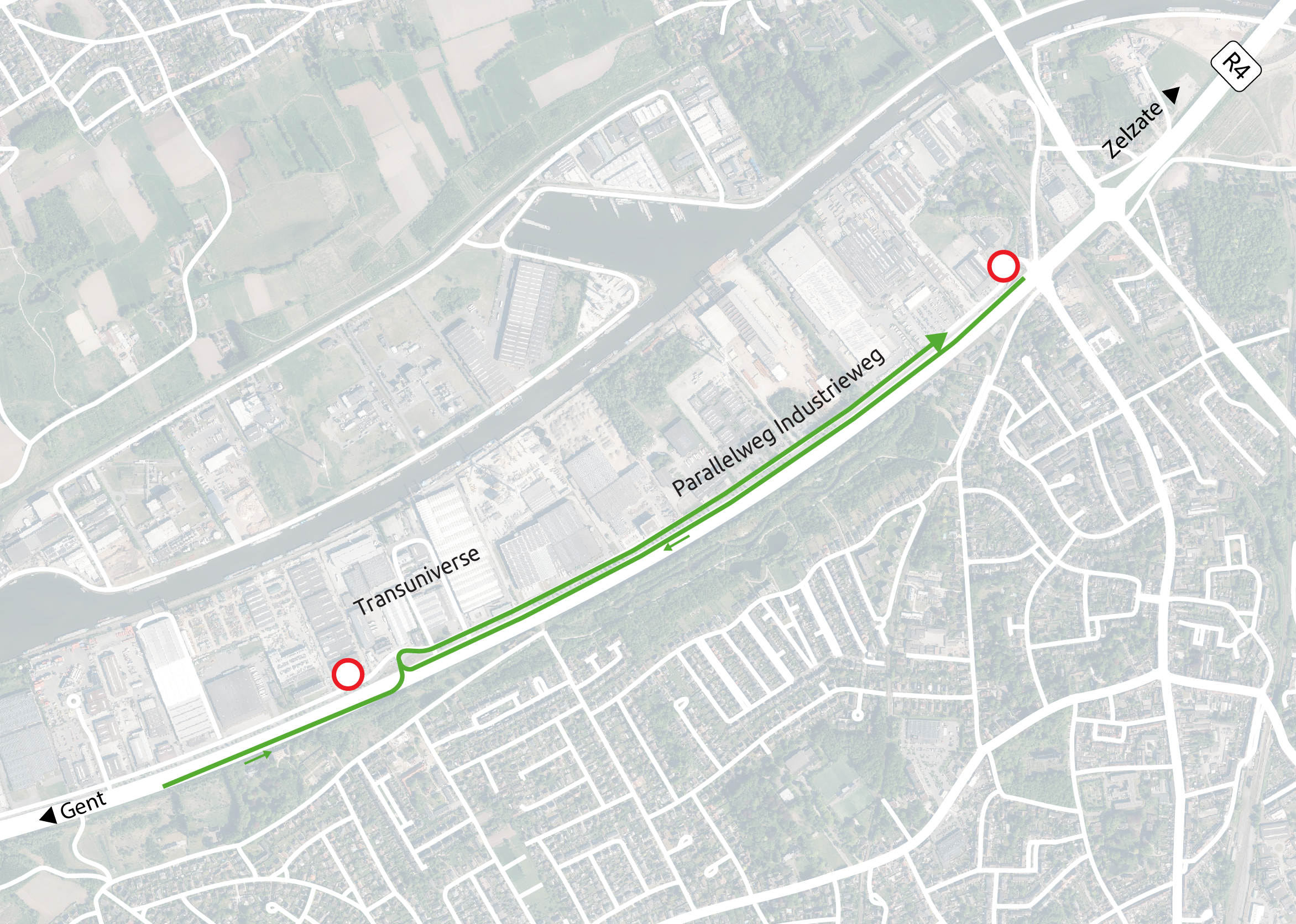 - 25 oktober – 2 november: geen uitwisseling mogelijk tussen R4 en de parallelweg Industrieweg aan het kruispunt Schouwingstraat- Evergemsesteenweg. Er wordt een omleiding voorzien via de R4 en de op-en afrit Transuniverse. Hou er rekening mee dat je aan dit kruispunt niet kan invoegen op R4 richting Zelzate. Rijd naar het knooppunt Brugsevaart, verlaat daar de R4 en rij hem opnieuw op richting Zelzate.