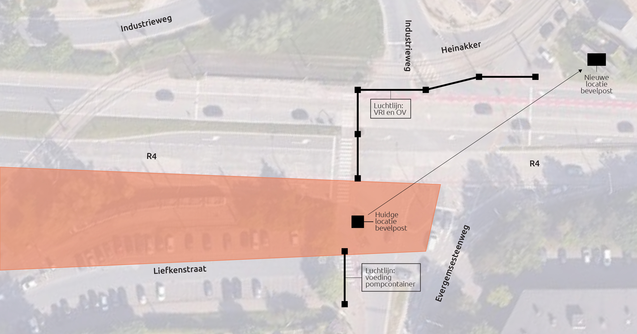 • We starten met de lichten op het kruispunt van de R4 met de Evergemsesteenweg en de Industrieweg (R4 parallelweg)